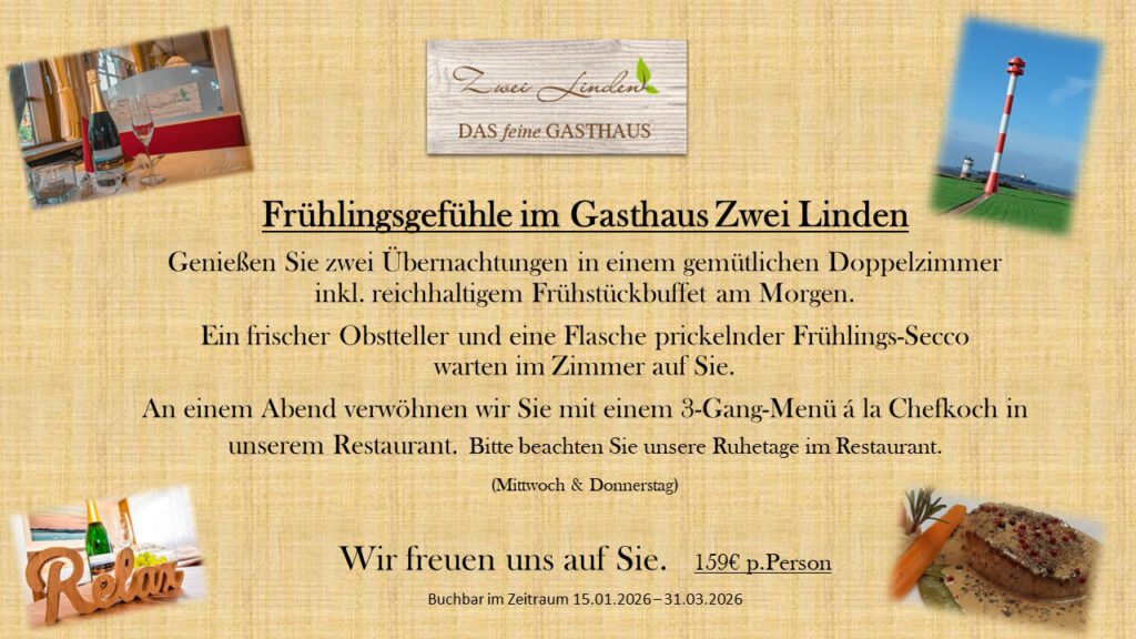Bitte beachten Sie: Da unsere Ruhetage im Restaurant immer mittwochs und donnerstags sind, können wir unsere Menüs in den Übernachtungsangeboten an diesen Tagen nicht wie gewohnt bei uns anbieten. Bitte setzen Sie sich telefonisch mit uns in Verbindung, damit wir eventuell eine Alternative finden .
